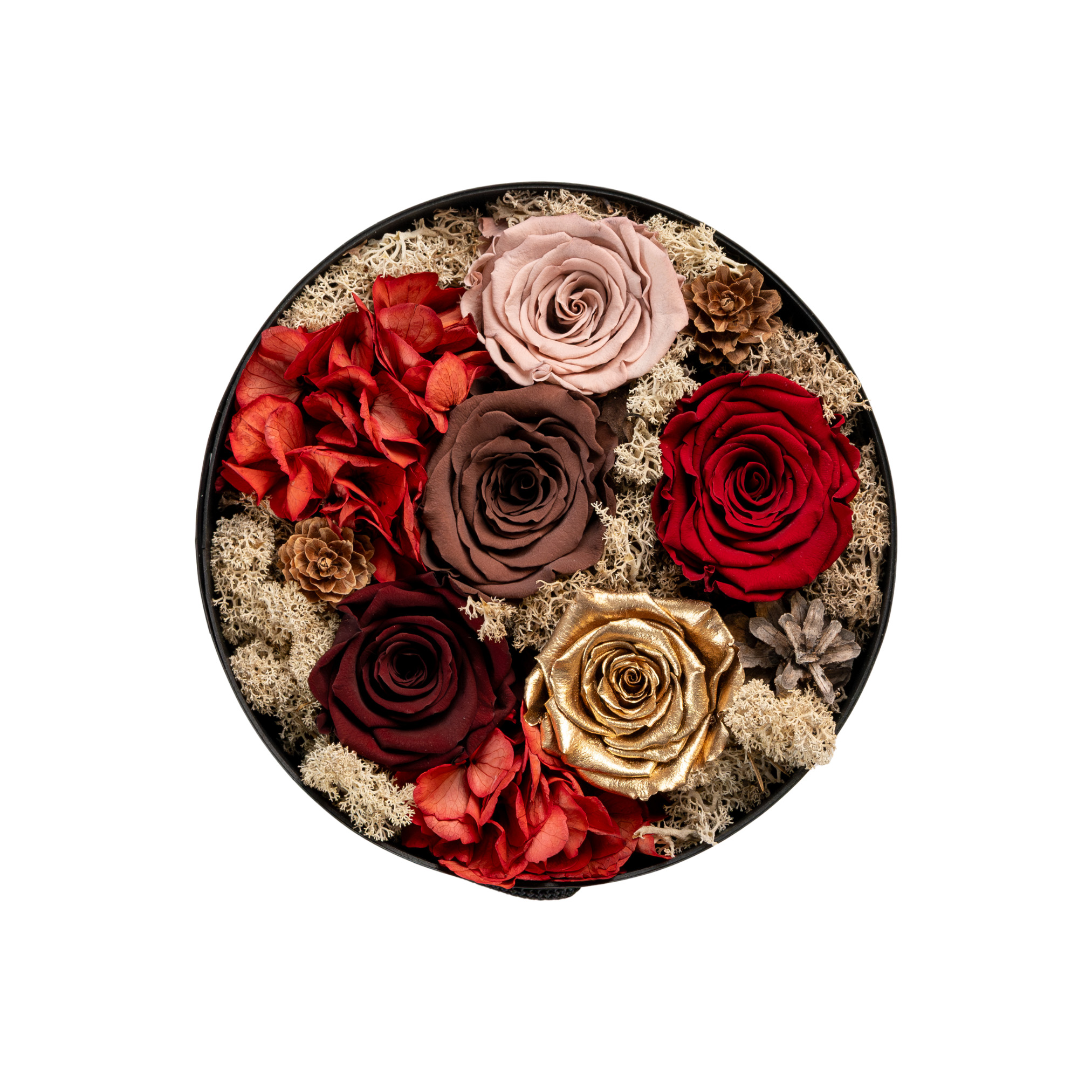 An impressive round box that highlights the harmony of contrasts, where the soft pink shade of the roses meets the deep red and the textures of the red hydrangea. Natural details, such as dried moss, create a composition full of depth and allure. A tribute to the warmth of winter and the beauty of nature, designed to decorate your space with refined elegance.Care InstructionsEternity Roses are real, preserved, and dyed roses that last for at least one year. However, with the following tips, you can enjoy their presence for much longer—up to five years or more.